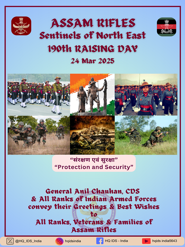 CDS and All Ranks of Indian Armed Forces convey their greetings & best wishes to All Ranks, Veterans & Families of the Assam Rifles on the occasion of their 190th Raising Day